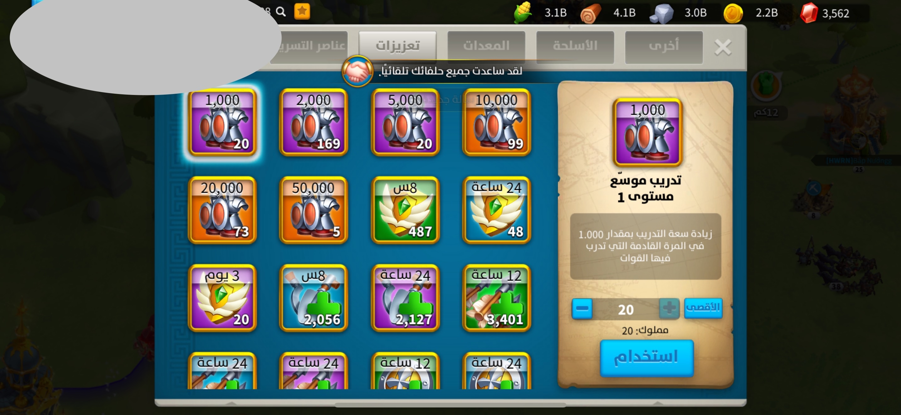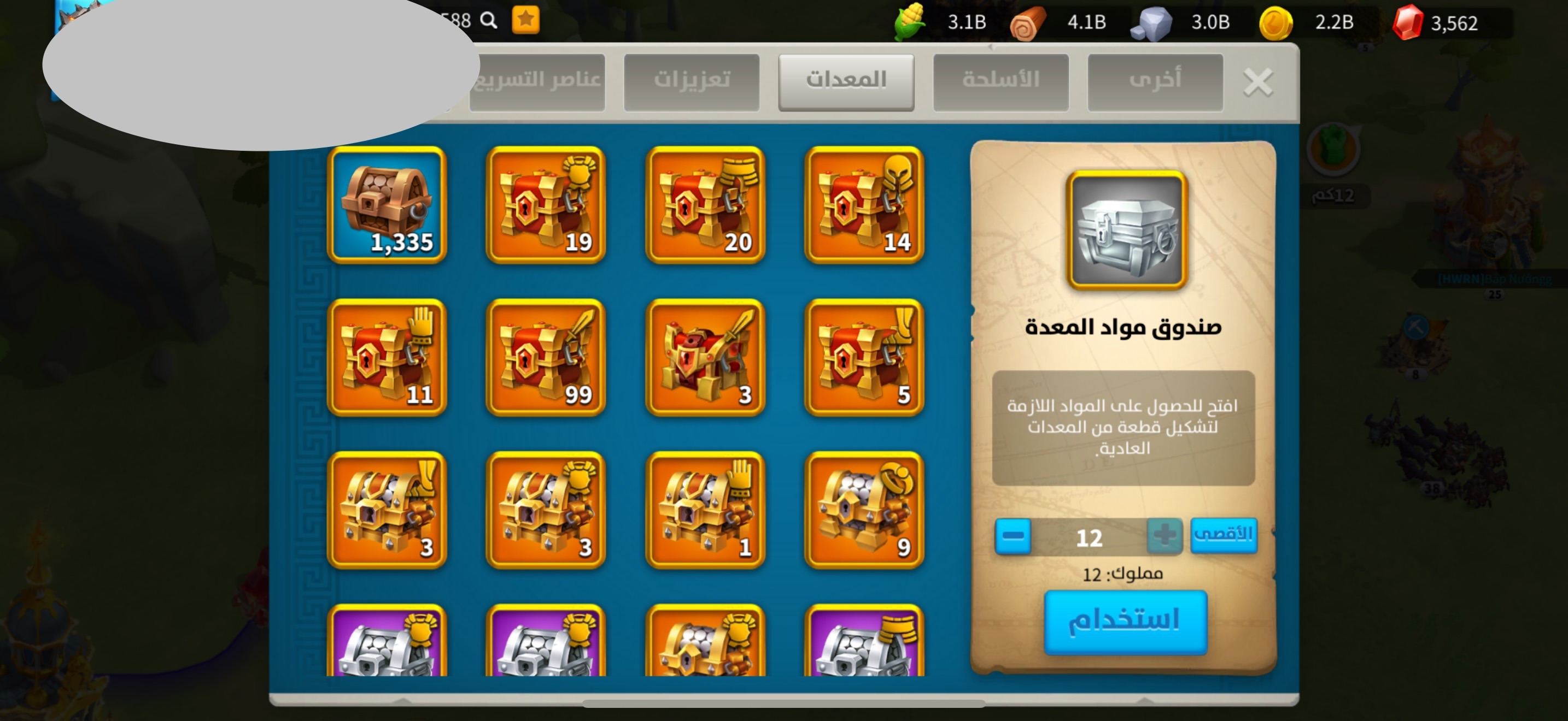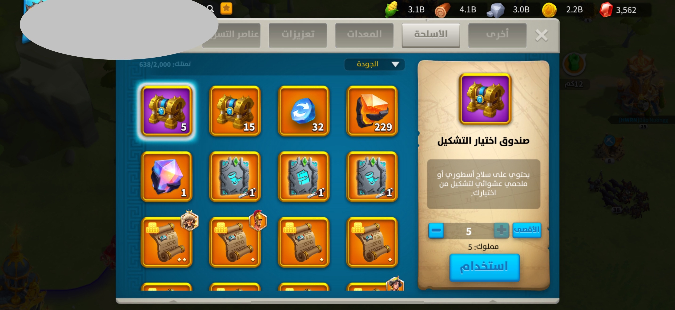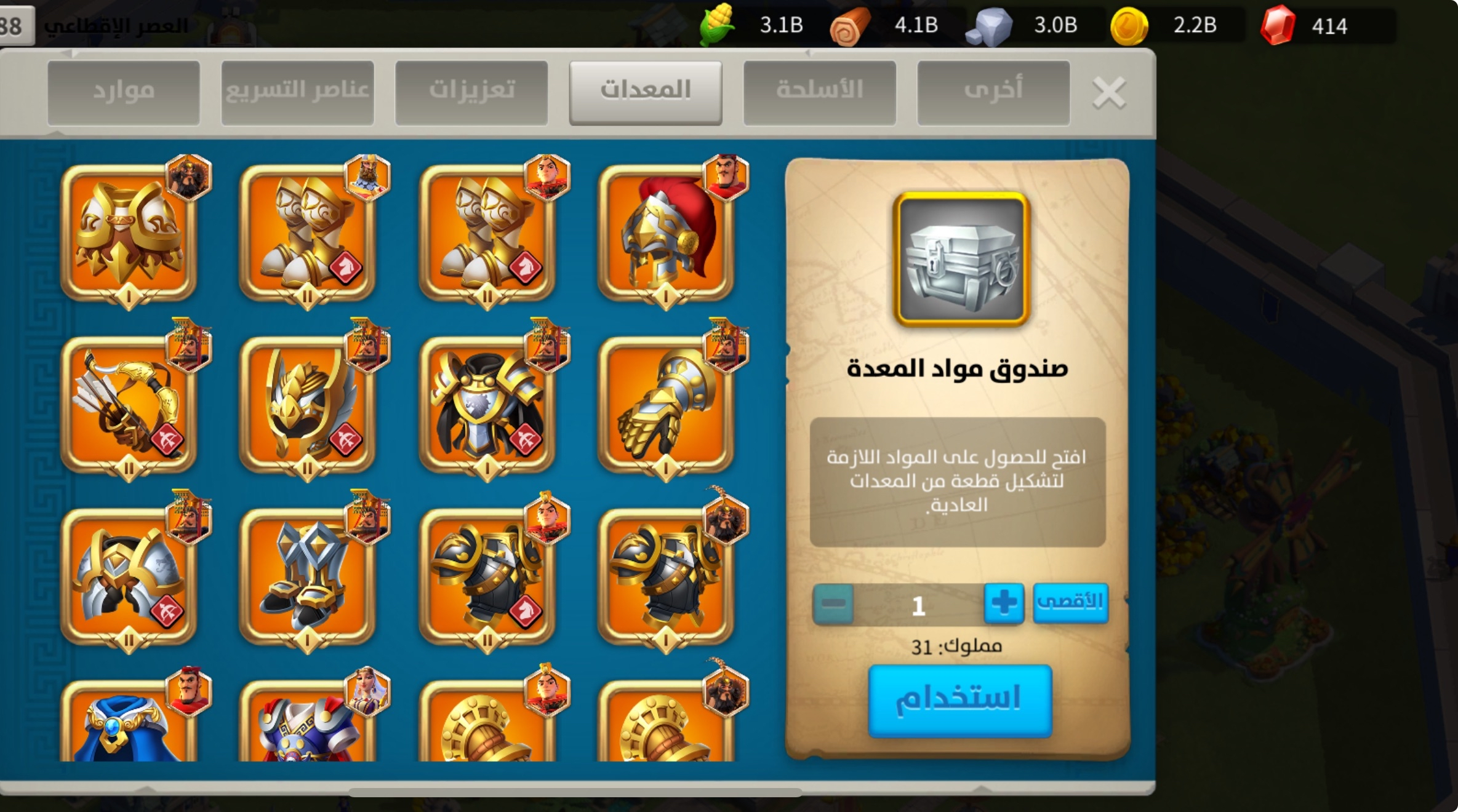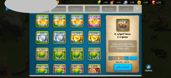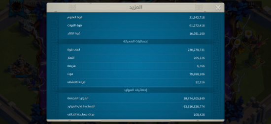 • kill: 13.4B نقاط القتل: 13.4 مليار , • power: 122M القوه: 122 مليون , • vip: SVIP ——————————- • Golden head: 940 ——————————- • passports: 158 جوازات السفر: 158 فضة : 20 م (جاهز للهجرة) ——————————- • maxed commanders: 54 القاده الماكس: 54 + كثير قادة قريب ماكس ——————————- • Legendary skins: 7 سكن مدينه: 7 ——————————- • legendary Equipments (special): 57 (34) معدات اسطوريه (مخصص): 57 مخصص : 34 ——————————- نقوش اسطورية : 5 مزارع : 2
